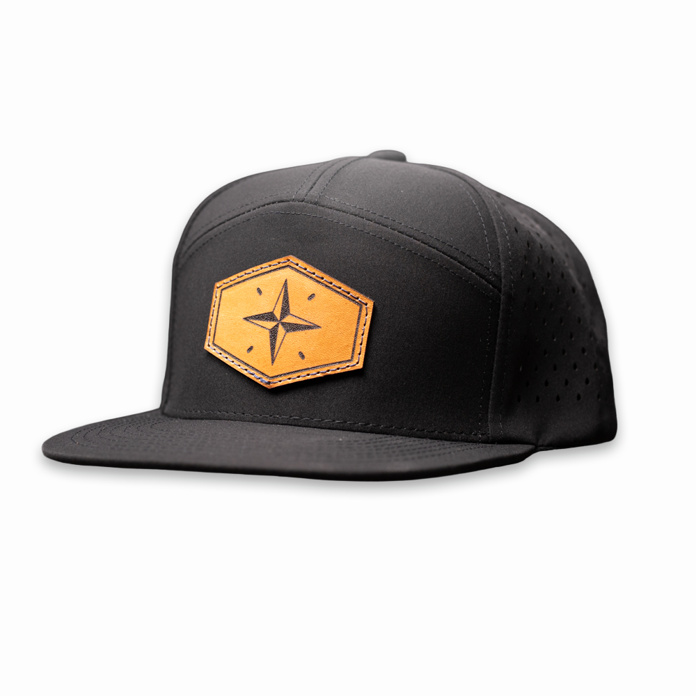 Get your BBS "7-Panel" Snapback Hat in black paired with a high-quality custom tan leather patch design before they're gone.
